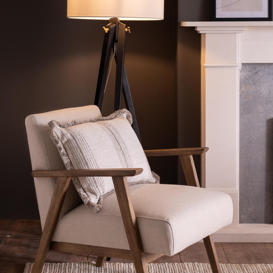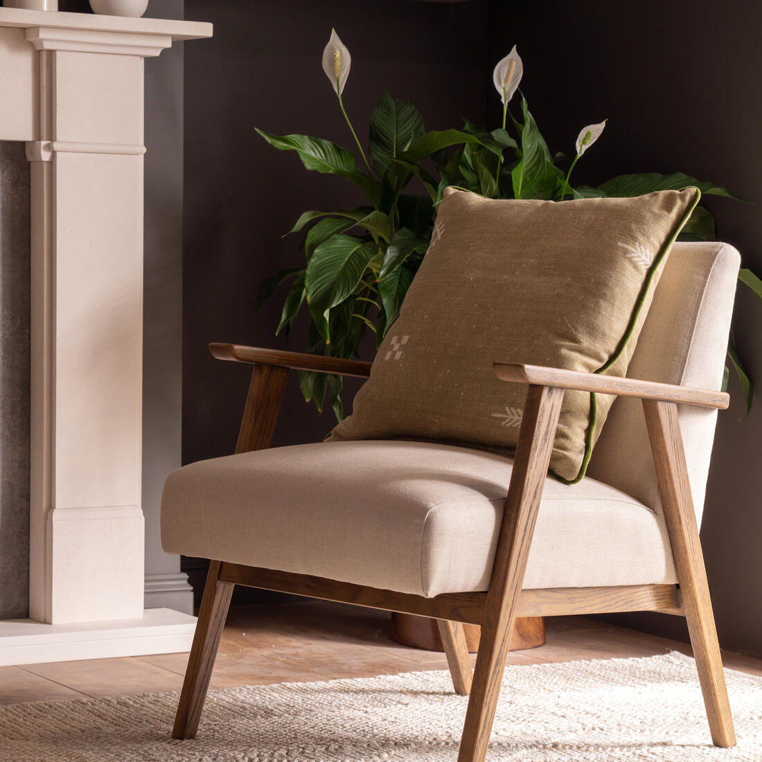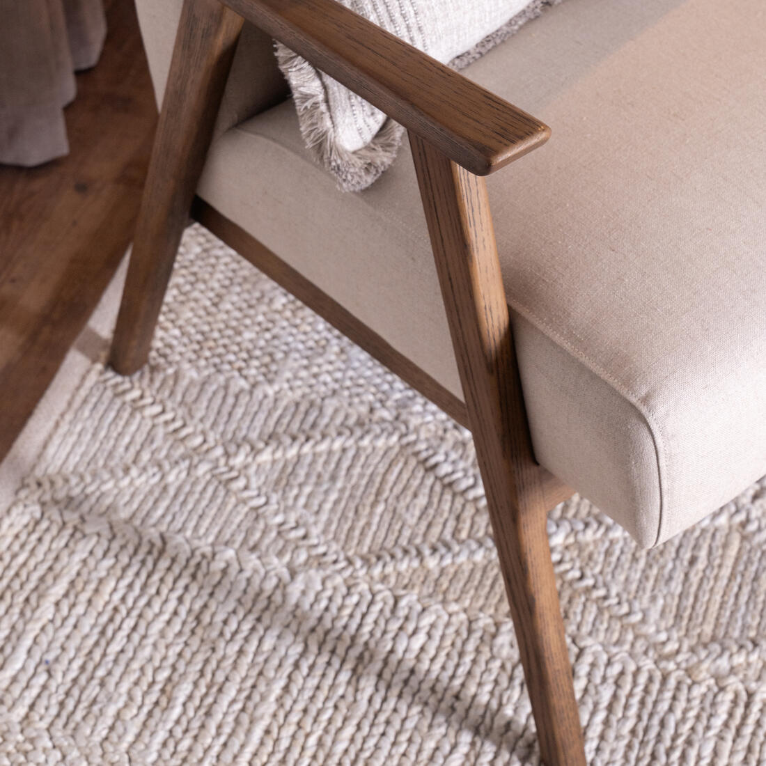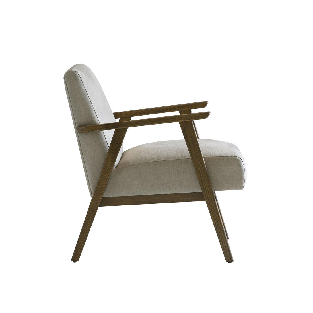 Riding off of mid-century design, the clean, laid back lines are perfect for calm, contemporary spaces. Angled legs run off of the sleek, sloped arms of a natural ash wood frame, which is complimented by the fresh natural coloured linen fabric with irregular textured slubs.