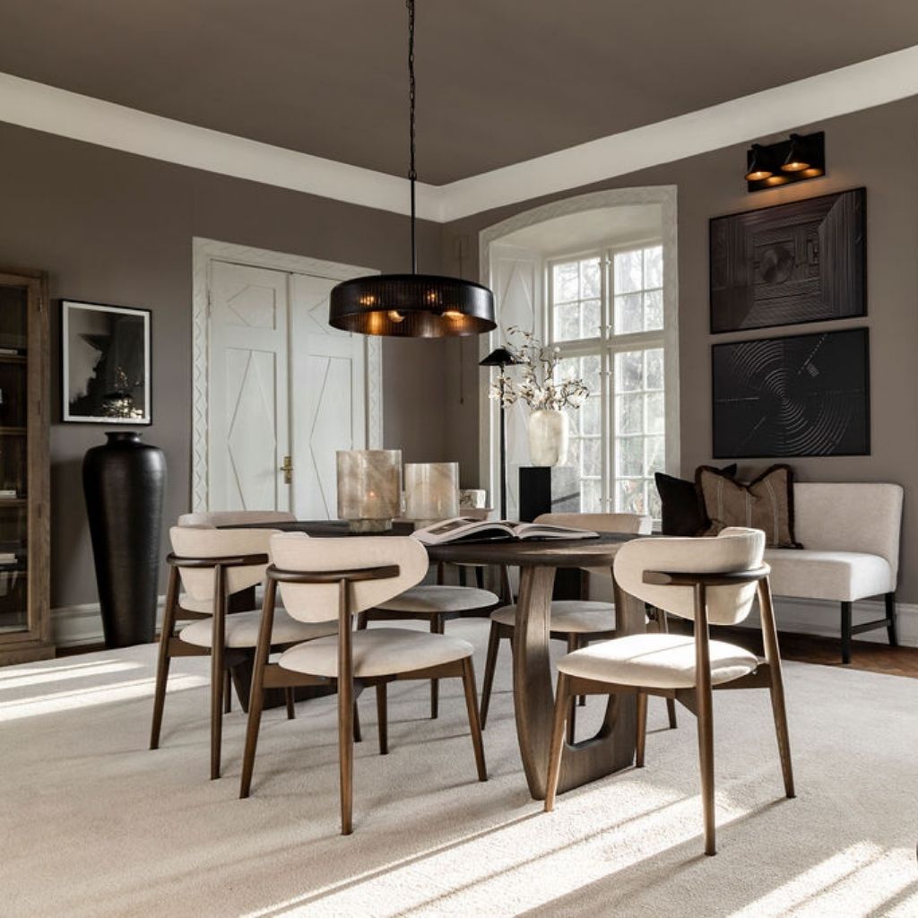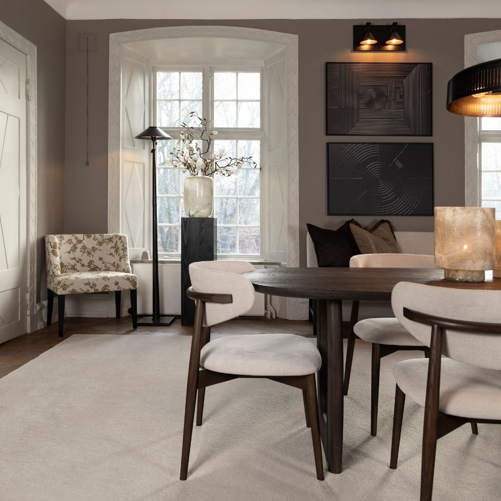 Avelin dining chair with a softly shaped back, ash legs in a Coffee finish, and durable upholstery in Tara greige.