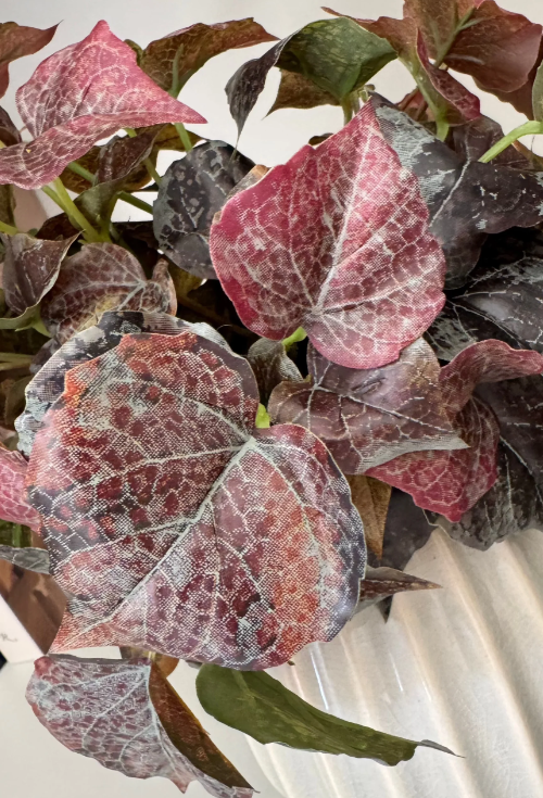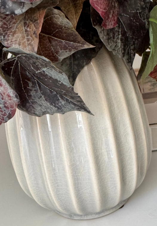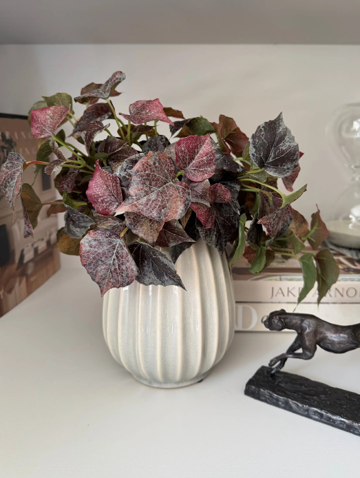 Burgundy Irish Ivy Spray arranged in a glazed cream vase with subtle baby blue undertones.
