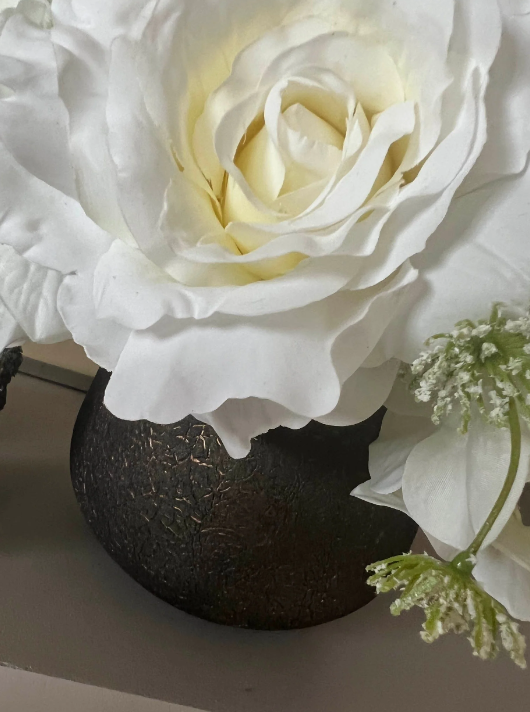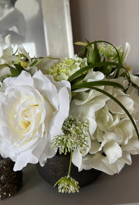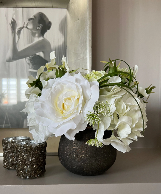 White Hydrangea & Rose Bouquet in Bronze Vase